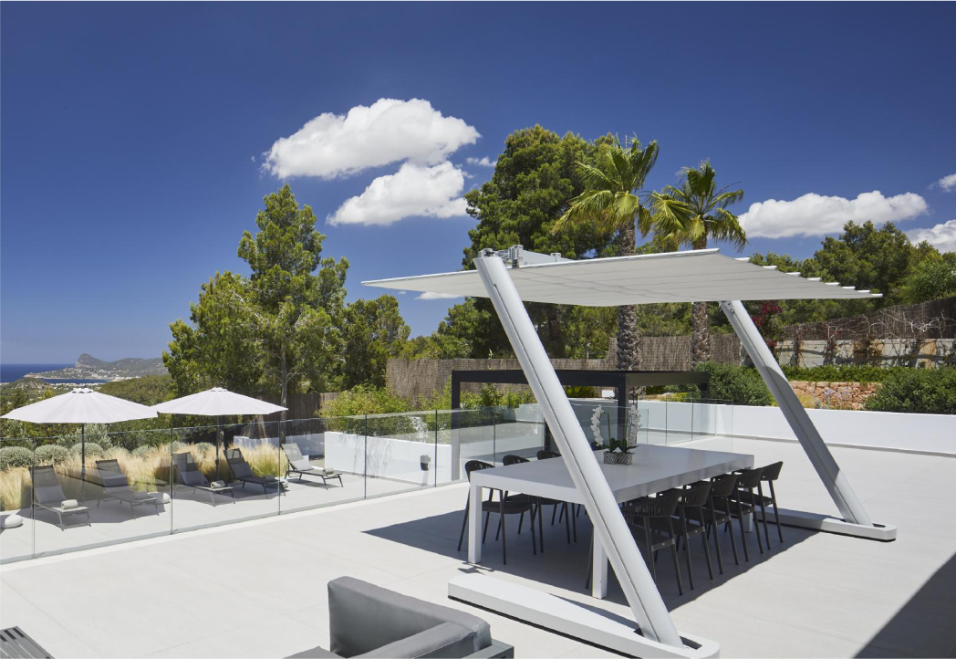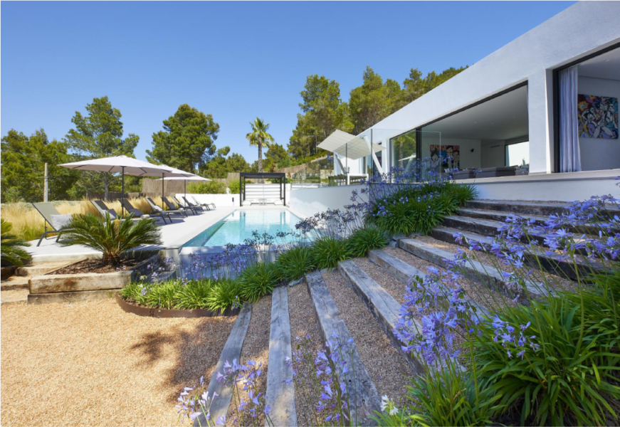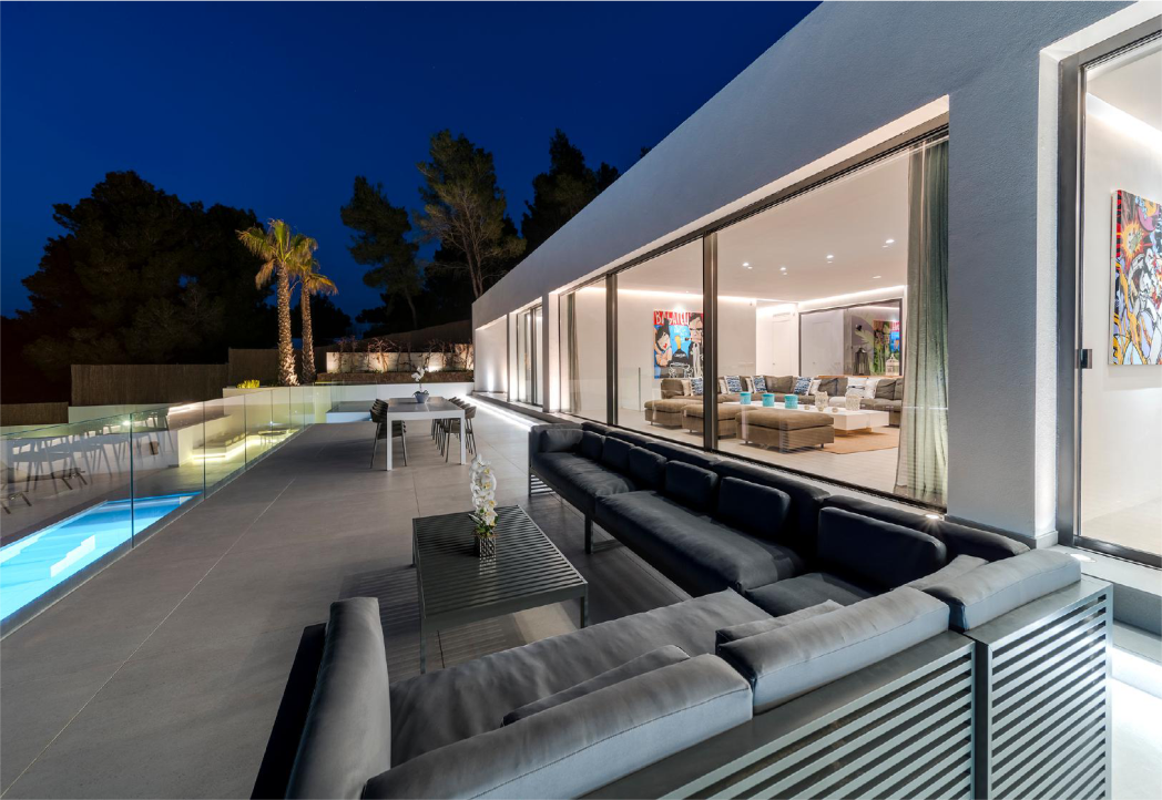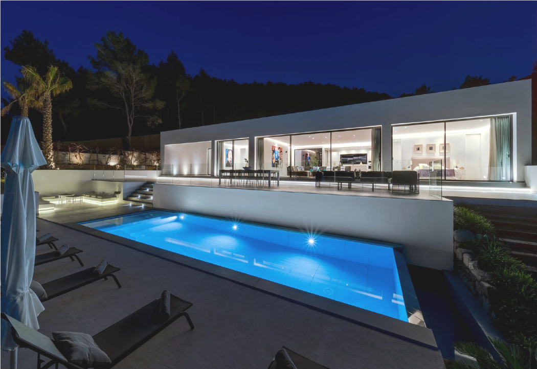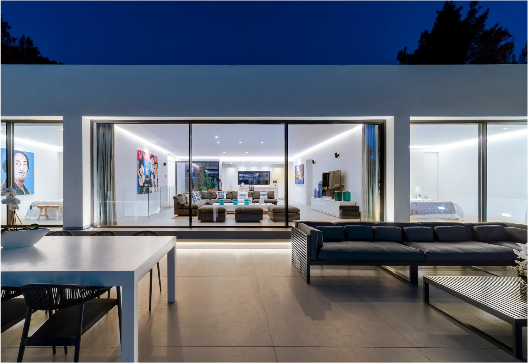 La villa está situada en lo alto de una de las zonas más exclusivas de Ibiza y desemboca en el paisaje natural. El proceso de diseño fue muy específico, y la concepción de los volúmenes y la distribución se adaptaron a la vista panorámica al mar.