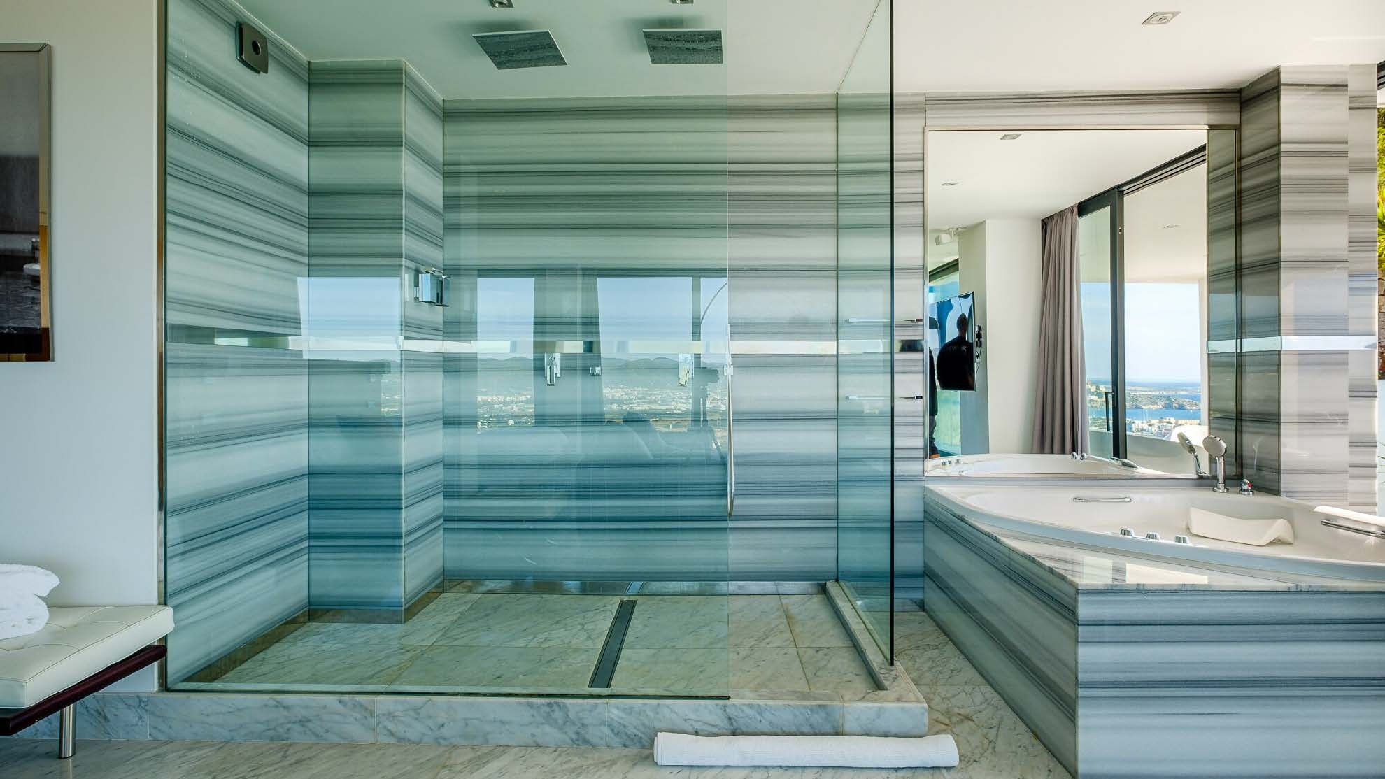 The bedrooms are all en-suite finished with high-end materials and sanitaryware. All rooms have independence and a sense of refuge whilst maximising the stunning views which are as wonderful in the glittering evening lights as during the blues of daytime. Extensive glazing invites in an excellent quality of natural light at every hour of the day optimising the technicolour spectacular sunrise and sunset skies.